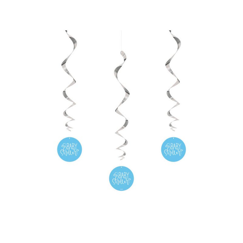 Ensemble assorti de trois suspensions argentées avec fanions "baby shower" sur fond bleu.