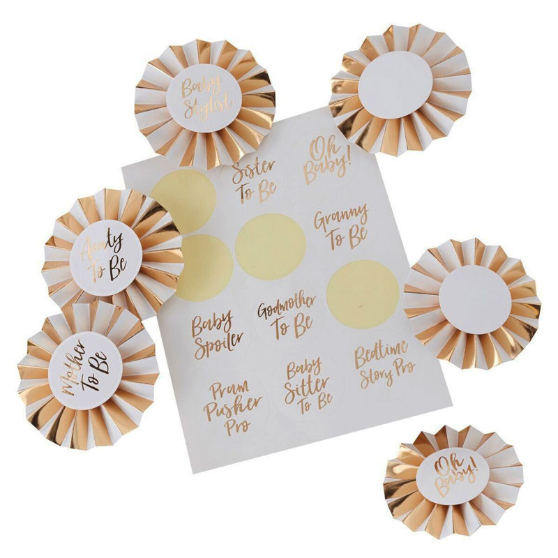 Kit comprenant 6 cocardes dorées et 12 autocollants pour personnaliser les cocardes.
