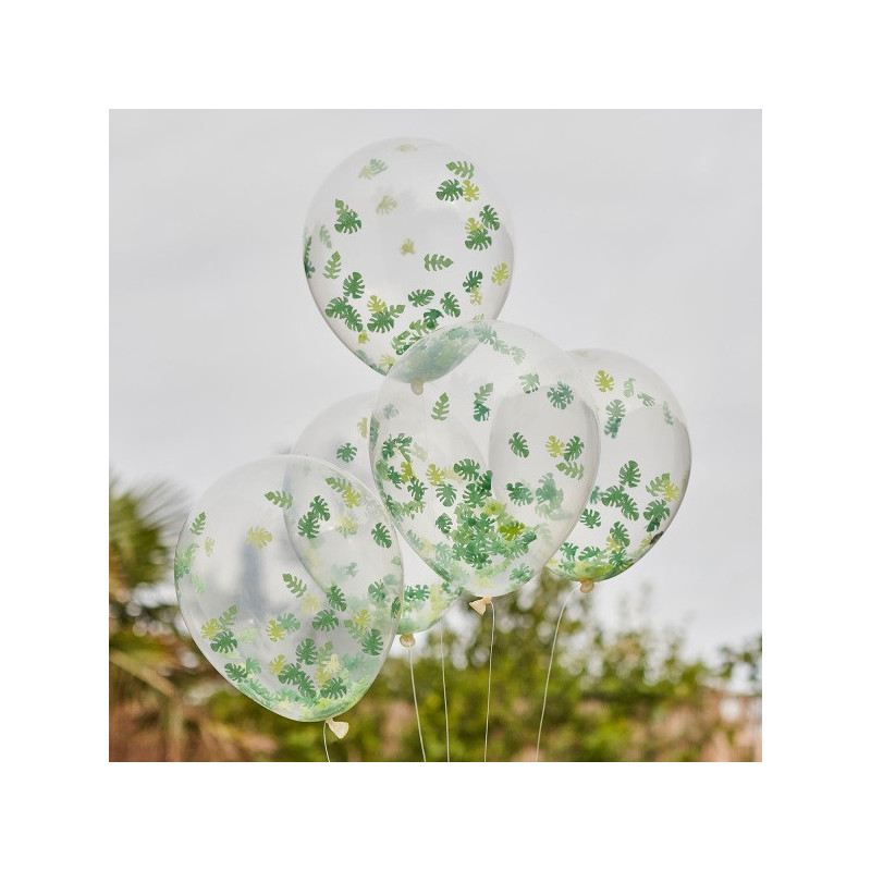 Vendus par sachet de 6 ballons déjà garnis de confettis feuilles tropicales.