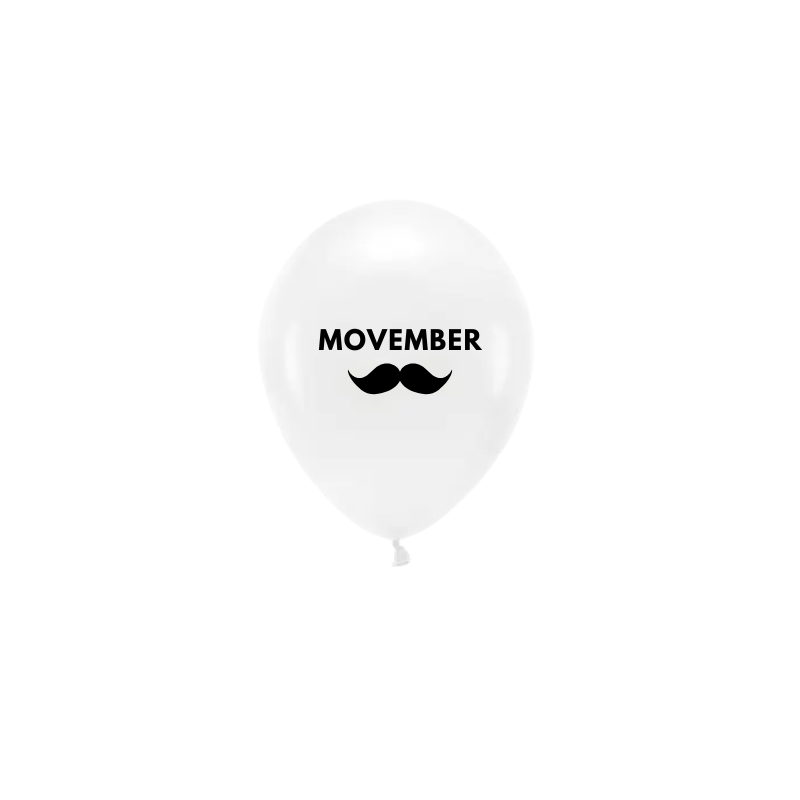 Ballons latex blanc Movember avec moustache noire avec une sérigraphie noire "Movember" pour célébrer le mois Movember.