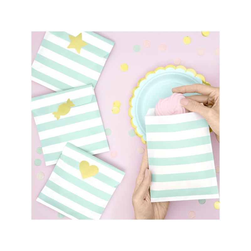 Jolis sachets en papier rayés en vert pastel et blanc pour organiser vos cadeaux invités avec des autocollants stickers coeur, étoiles ou bonbon en doré brillant.