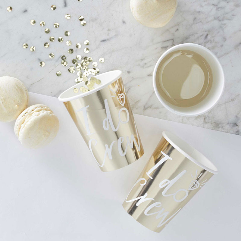 Vous préparez une fête de mariage ou un enterrement de vie de jeune fille ? Ne cherchez pas plus loin ! Nos gobelets en papier dorés "I do Crew" ajoutent une touche de glamour à toutes les occasions festives. Avec leur inscription élégante en blanc, ces gobelets apportent une ambiance festive à votre événement.