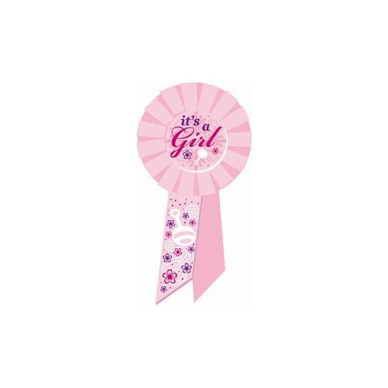 Joli badge de qualité avec des rubans satinés rose marquage de fête "It's a Girl" pour fêter l'arrivée d'une petite fille! Idéal pour une baby shower party.