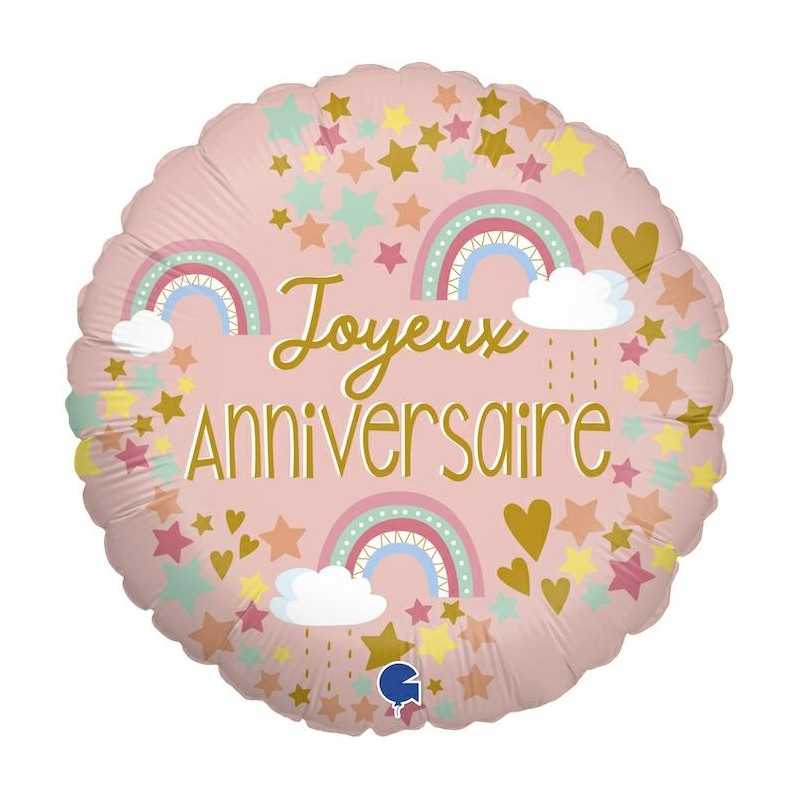 Beau Ballon Alu Joyeux Anniversaire Arc-en-ciel en français pour un thème bohème tendance.