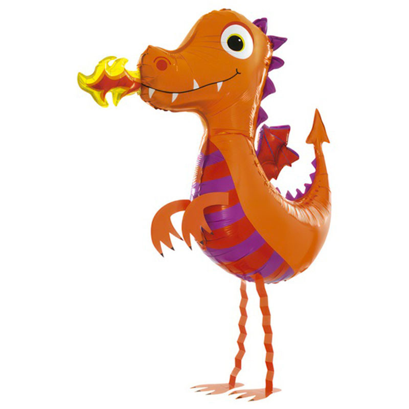 Joli ballon alu mylar en forme de Dragon orange pour votre décoration de fête. Ce ballon se gonfler à l'air et permet de se stabiliser pour faire marcher le Dinosaure Vert au pas!