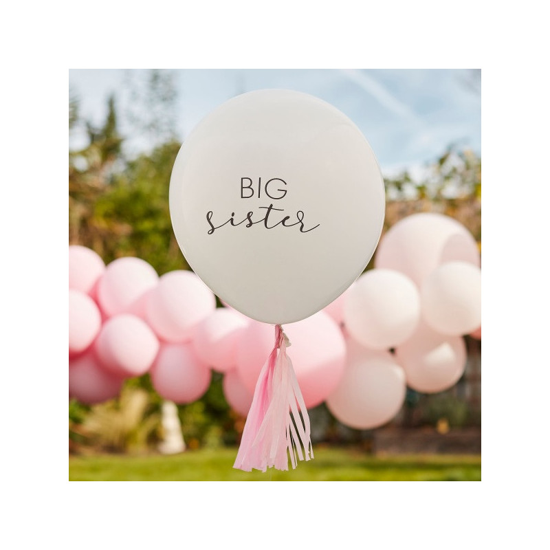 Kit pour faire un grand ballon marqué "Big sister" orné de tassels roses pour offrir à la petite fille qui s'apprête à venir grande soeur!