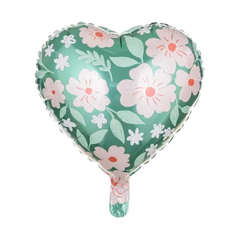 Magnifique ballon alu / mylar pour une décoration de fête avec un joli vert et des fleurs rose poudré, esprit liberty.