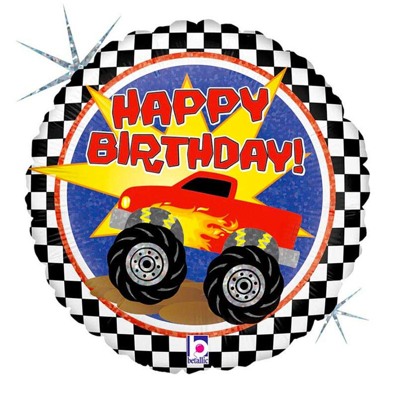 Jolie décoration avec ce grand Ballon Rond Anniversaire Voiture de Course Rallye avec un marquage Happy Birthday et drapeaux de course.