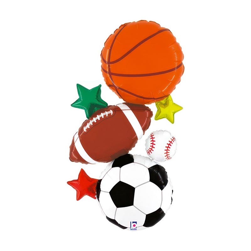 Grand ballon en forme de ballons à l'effigie du multi sport avec football, baseball, rugby et basket ball.