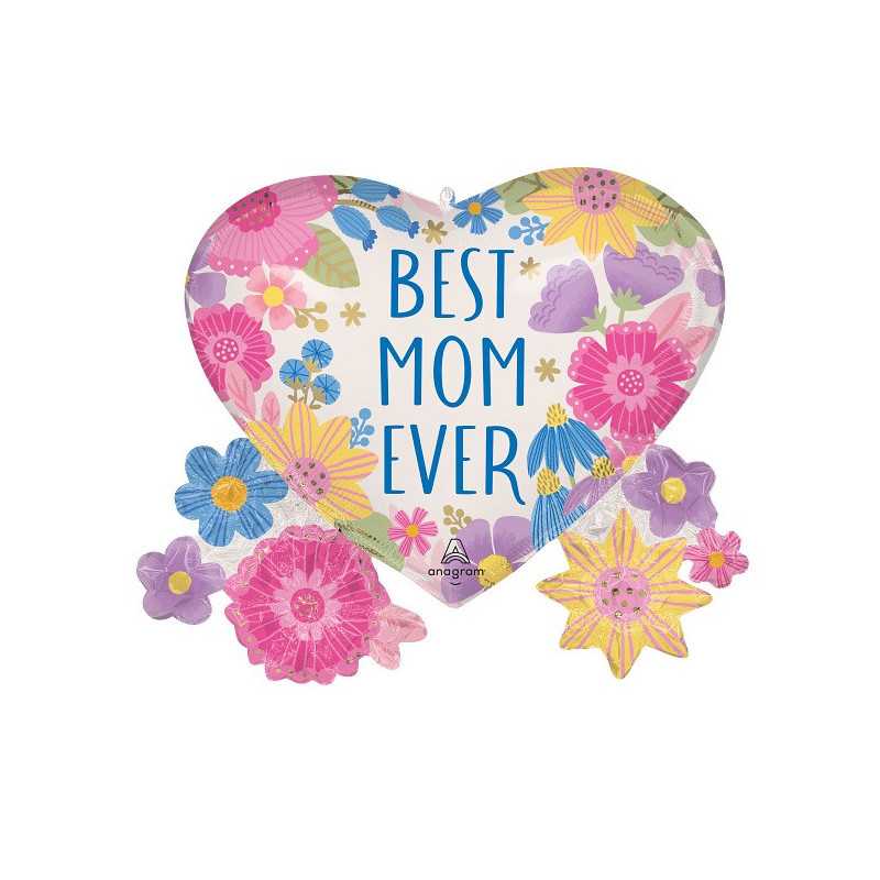 Design : Inscription "Best Mom Ever" entourée de fleurs stylisées dans des tons vifs et joyeux