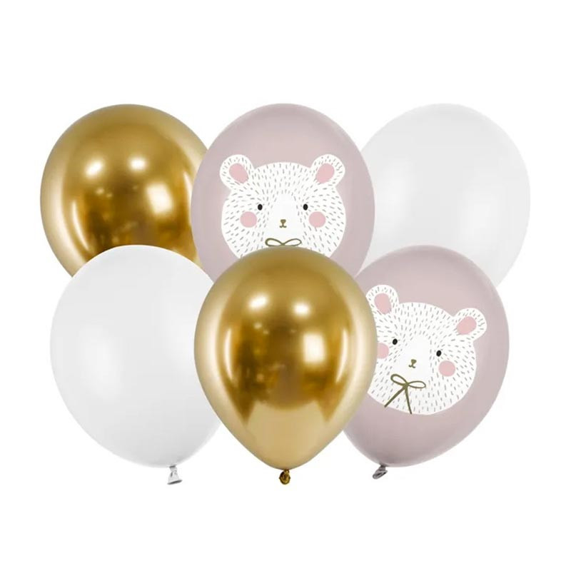 Sachet de 6 ballons latex premium blanc, doré chromé et motifs teddy pour une jolie décoration de fête.