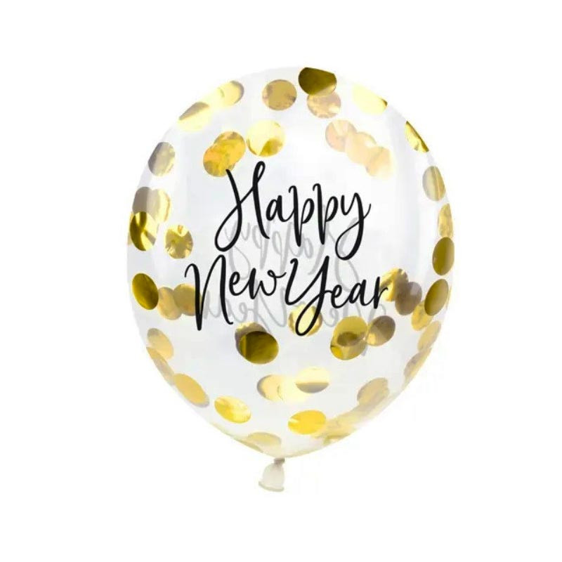 Jolis ballons transparents marqués "Happy new year" garnis de confettis doré brillant pour votre déco de fête