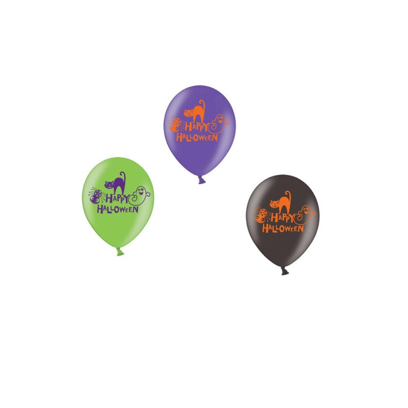 Jolis ballons latex pour une déco Halloween pour enfants avec des ballons citrouille, vert violet et noir avec chat et fantômes.