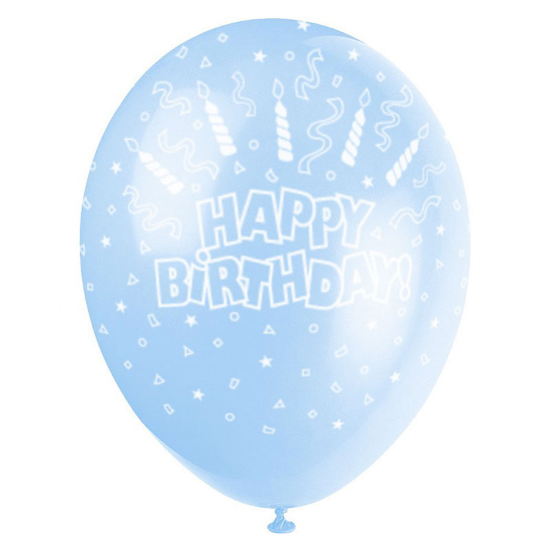 Ballons de couleur bleu nacré, marqué "Happy Birthday" en blanc avec motifs bougies.