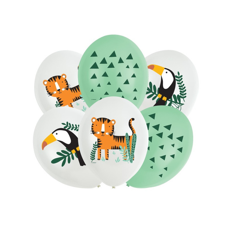 Ce lot de ballons latex sérigraphiés est parfait pour une décoration imaginatif sur le thème de la jungle ou tropical. Ajoutez une ambiance exotique à votre baby shower, gender reveal ou anniversaire fille ou garçon avec ces ballons colorés représentant des toucans et des tigres.