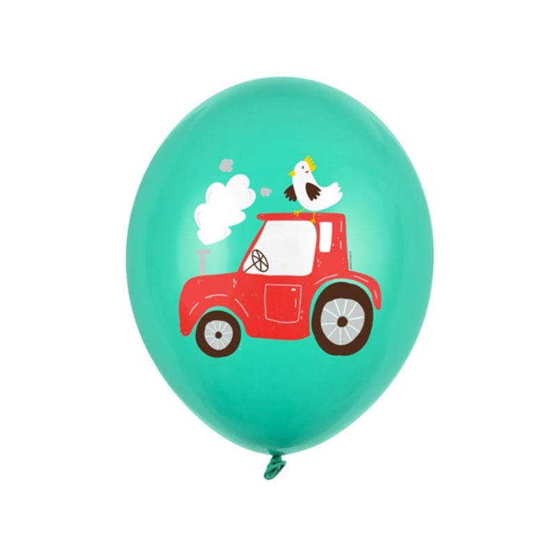 Jolis ballons en latex avec motif tracteur et poule pour votre décoration de fête sur le thème de la ferme.
