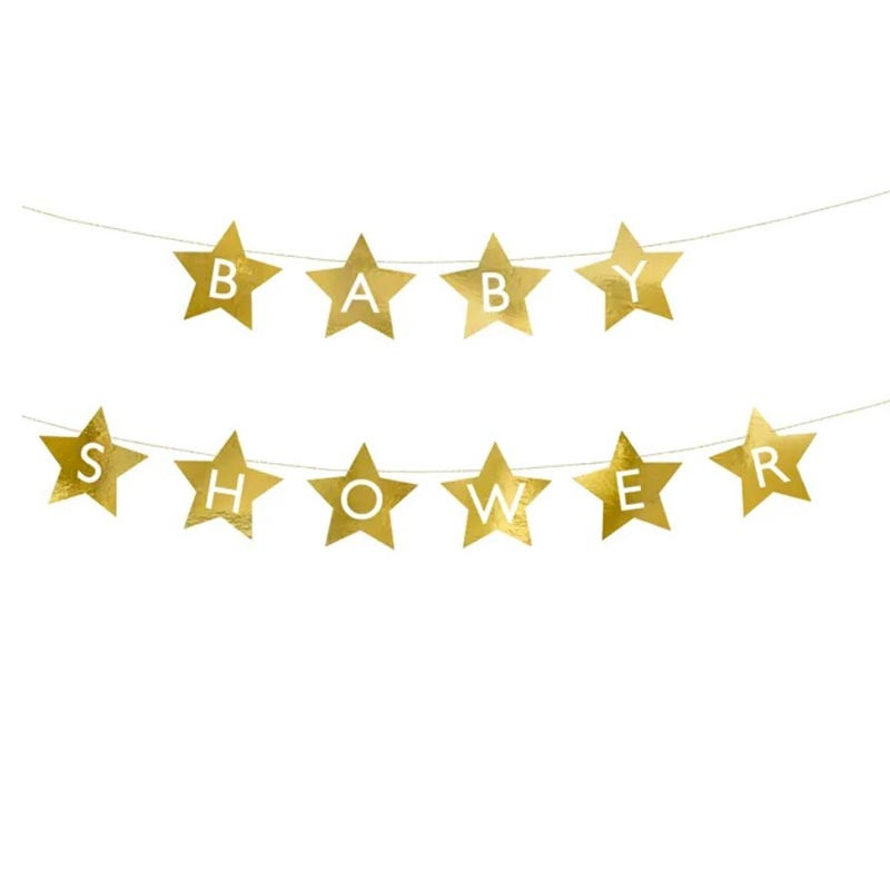 Jolie banderole "Baby Shower" avec fanions étoiles dorées à l'emploi pour votre décoration de fête.