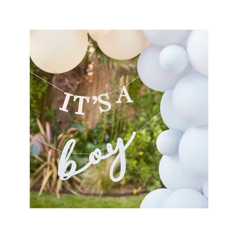Jolie banderole en anglais "It's a boy" en lettres premium beige prête à l'emploi pour votre décoration de fête