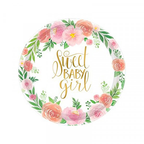 La vaisselle jetable à fleurs et les décorations viennent de notre collection Shabby Chic aux motifs floraux. La collection de fête présente des articles à motifs fleurs et d'autres marqués "Sweet Baby Girl" en doré.