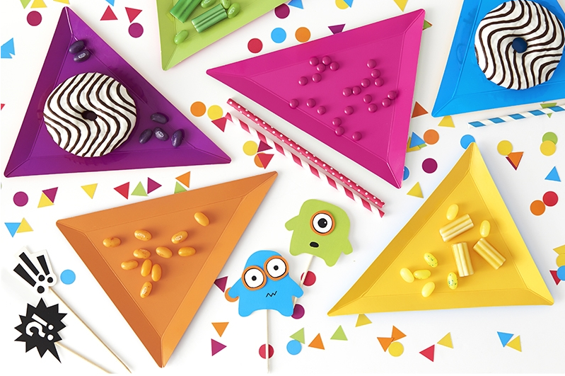 - les assiettes / barquettes en forme de triangle : elles remplacent les assiettes traditionnelles. Elles sont bicolores (une couleur au recto et une autre couleur au verso) et assorties à la collection. Vous choisissez le côté préféré : rose, bleu, vert, jaune, orange ou encore violet.