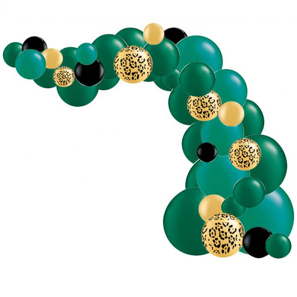 On adore la guirlande de ballons xxl avec des ballons jungle vert, vert foncé nacré, blanc et à motifs zèbre.
