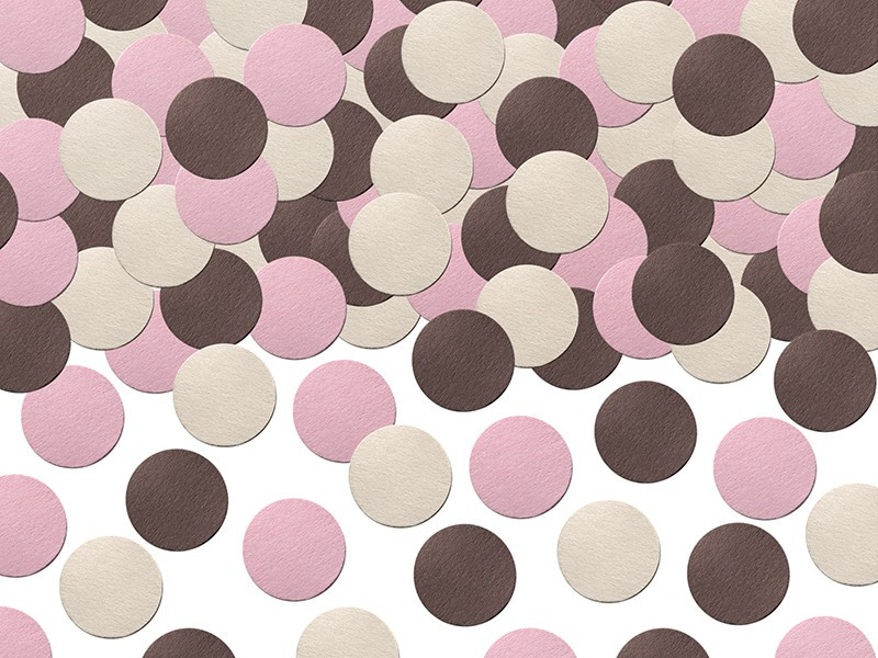 Pour le buffet, il vous faudra une nappe et jupe de table rose clair. Les sets de tables rose & chocolat sont posés sur la nappe (deux à la verticale, un au milieu à l'horizontale). Les gobelets sont très jolis et peuvent être présentés en pyramide. Des rubans chocolat (25mm de largeur) et rose pastel (6mm de largeur) pour décorer les bonbonnières remplies de soucoupes roses, bonbons roses et billes caramel. Quelques petits pompons ornent aussi la table.