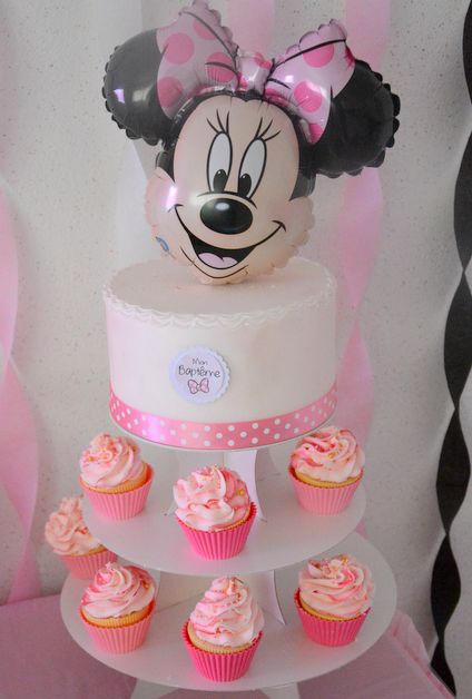 Le design cake étant simple sur un étage, il a été placé au dessus d'un stand à cup cake blanc. Il est décoré avec un mini ballon Minnie Mouse Disney. Si vous optez pour un gâteau simple, vous pouvez facilement le décorer vous-même comme sur cette photo avec un mini ballon gonflé à l'air, des rubans à la base qui correspondent à votre thème, ou encore une figurine.