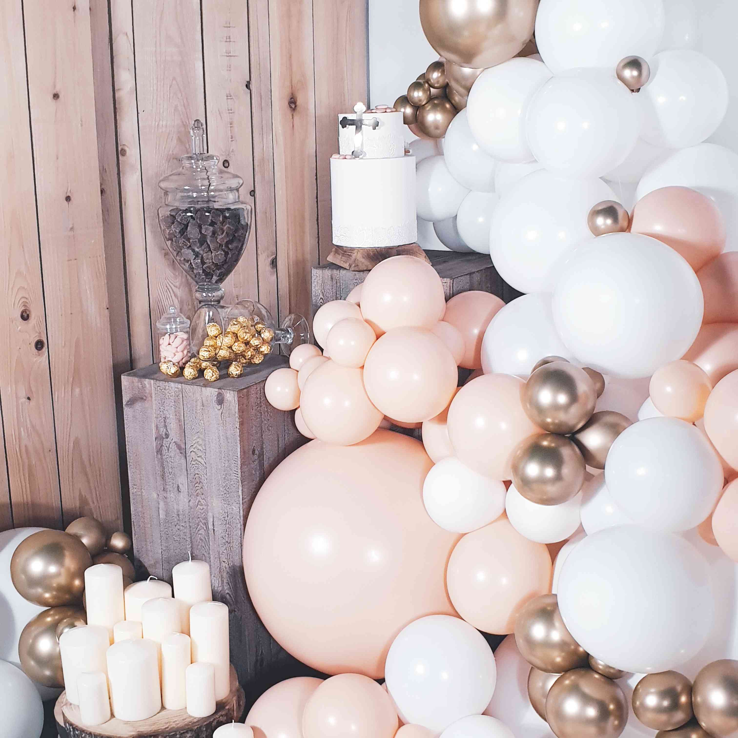 Gwen du Ballon Elégant est notre décoratrice partenaire du côté de Lille. Elle a créé une cascade de ballons dont les tons sont sublimes. Vous retrouvez le blanc, pêche très demandé en ce moment et le doré chromé. Elle a réalisé cette jolie scénographie originale pour la communion de Maelis.