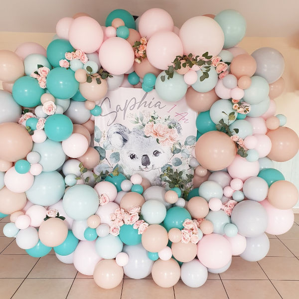 Plusieurs ballons en couleurs pastel s’harmonisent avec l’ensemble. N’oubliez pas que les différents éléments de la décoration doivent correspondre au thème. Dans le cas ci-dessous, on parle de koala.