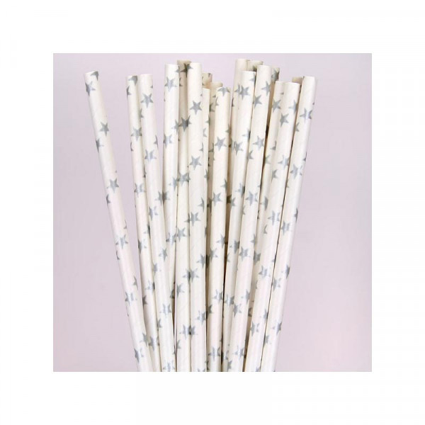 La vaisselle jetable est assortie avec des pailles étoilées et argentées.