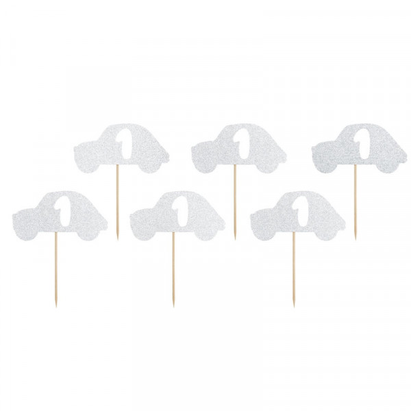 La touche argent pailleté est aussi sur les cup cakes avec nos ravissants piques cup cakes en forme de voiture avec le chiffre un.