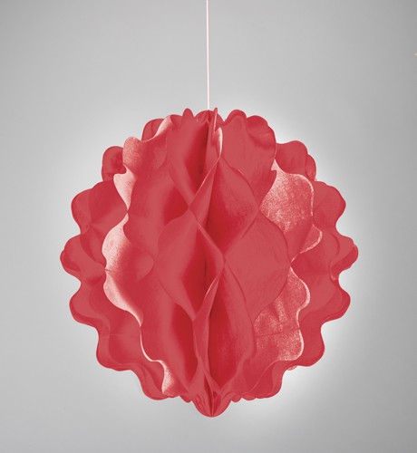 La touche décoration est simple avec un grand rideau à feuilles, une nappe et jupe de table rouge, et quelques boules alvéolées qui ornent la table.