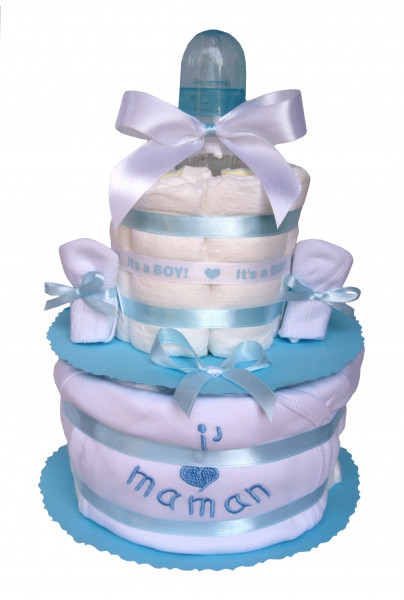 Mybbshowershop.com vous propose désormais des gâteaux de couches à deux, trois voire quatre étages. Les Gâteaux de couches mybbshowershop.com existent en bleu et rose mais également bien d’autres couleurs !