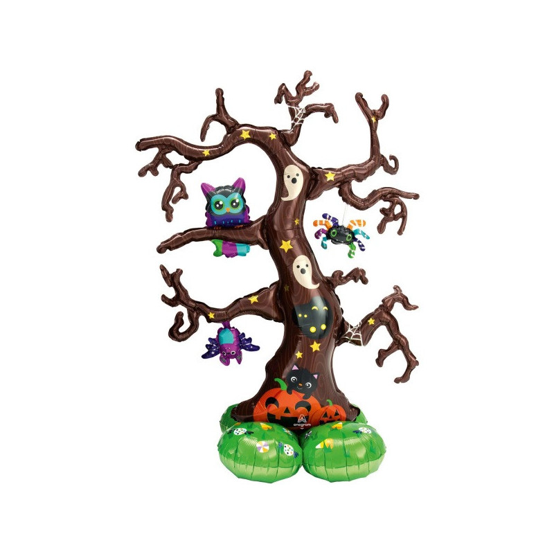 Grand bouquet de ballon alu à gonfler à l'air uniquement et tient parfaitement droit avec un grand arbre et des fantômes, chauve-souris, hiboux et araignées.