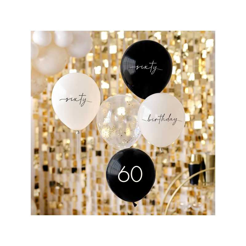 - Vendus par lot de 5 ballons assortis avec deux ballons beige "sixty" et "birthday", deux ballons noirs "sixty" et "60" avec un ballon transparent à confettis dorés chromés