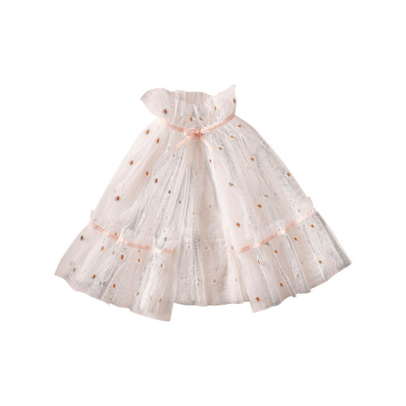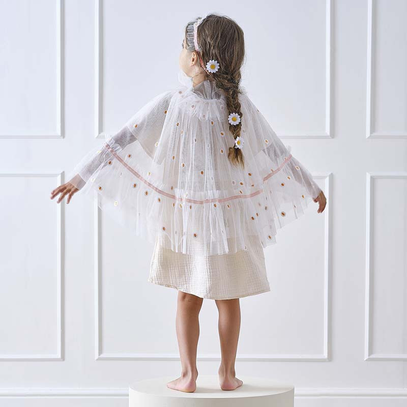 Très belle cape blanche avec broderies marguerite en sur-costume et déguisement facile à porter pour les enfants en tissu.