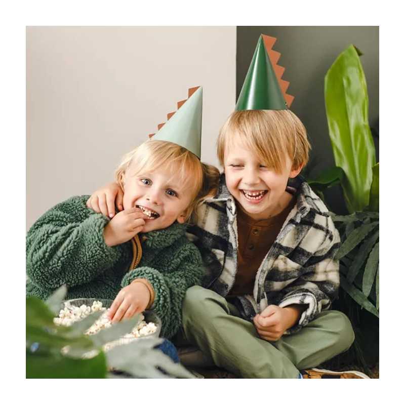 Jolis Chapeaux Dinosaures Anniversaire Enfant en papier avec les piques de dinosaures thème dinosaure pour fêter l'anniversaire de votre enfant sur le thème Safari ou Jungle Party.