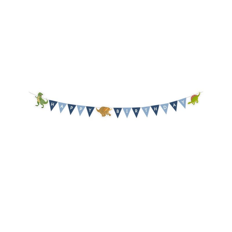 Belle banderole à fanions "Happy birthday" thème dinosaure avec un tyrex, un tricératops etc.