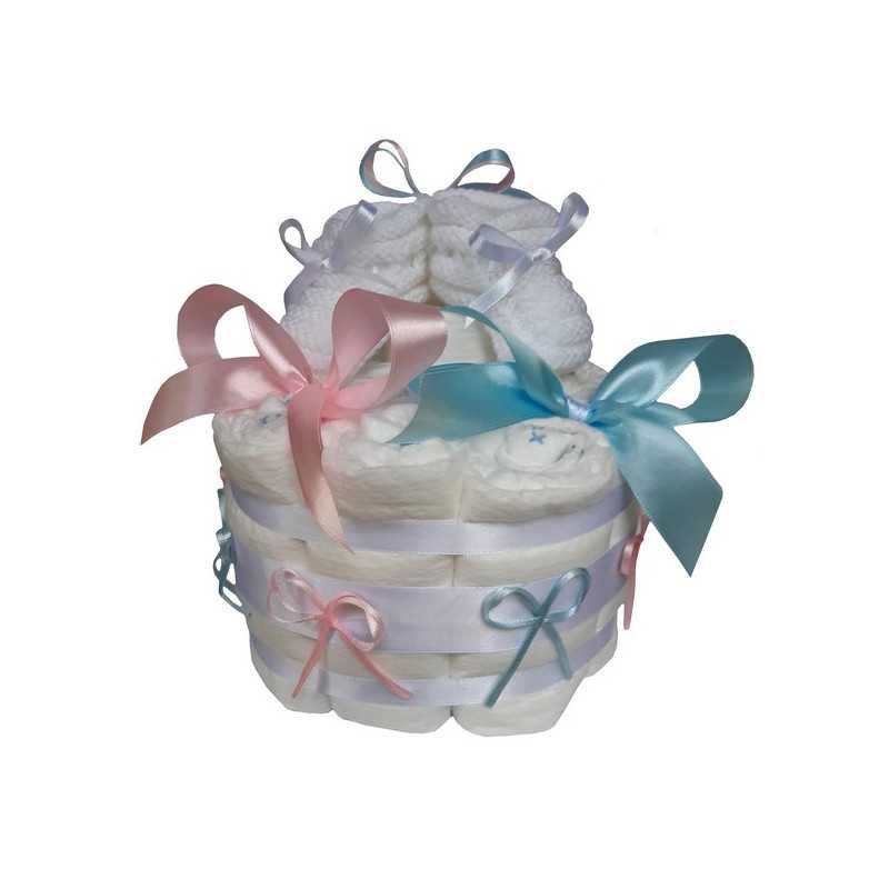 Petit cadeau naissance, ce gâteau de couches est garni d'un paire de chaussons en laine fait-main. De jolis rubans et noeuds roses et bleus décorent ce diaper cake et en font aussi un cadeau original pour une gender reveal.