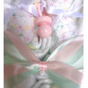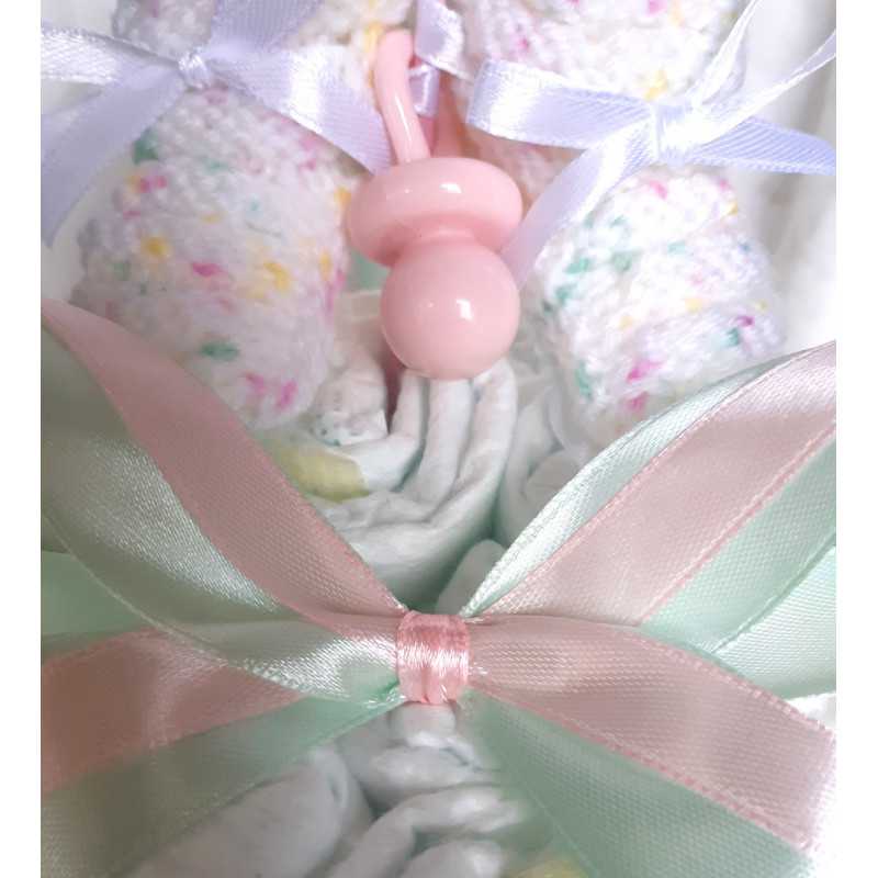 Fabriqué avec 12 couches pampers et décoré de rubans rose et mint, et d'une petite tétine décorative rose