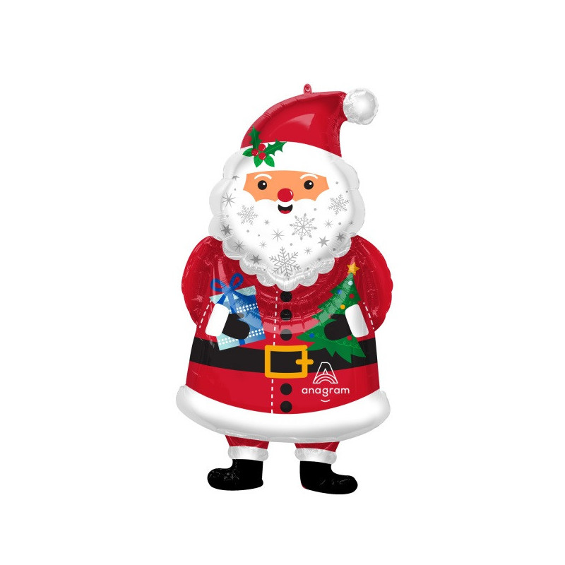Grand Ballon XXL Père Noël en aluminium portant des cadeaux pour une décoration de Noël.