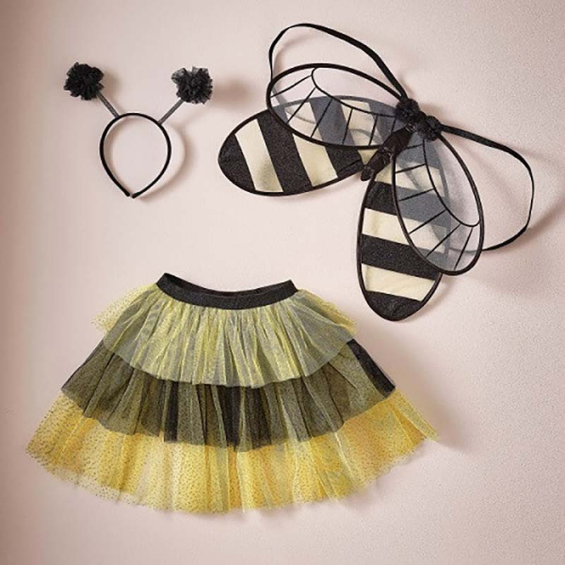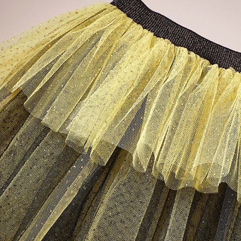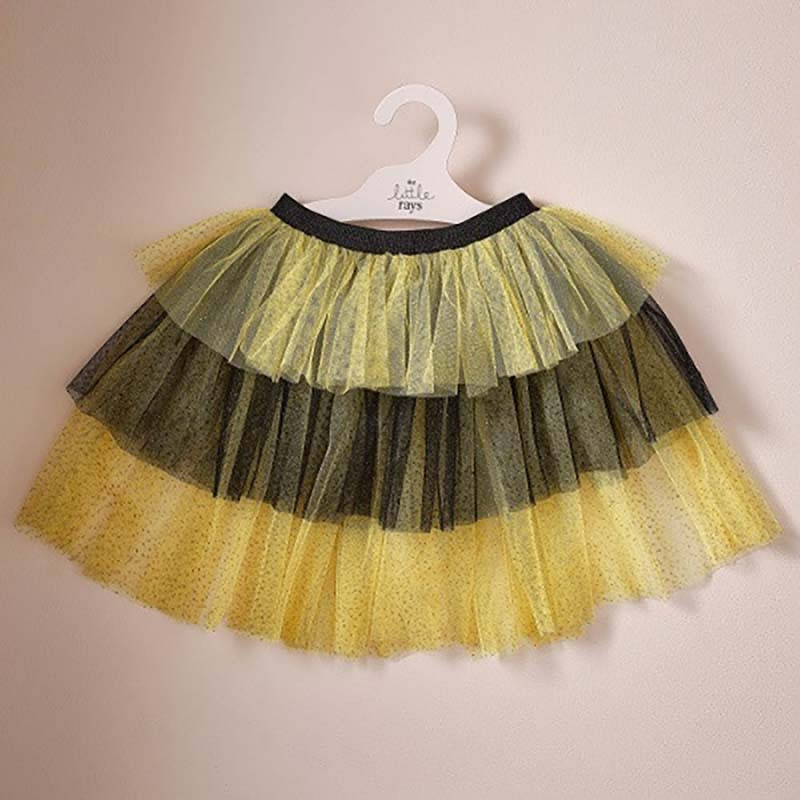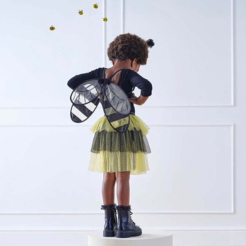 Très belle jupe abeille effet tutu en tulle jaune et noir en sur-costume et déguisement facile à porter pour les enfants en tulle avec détails glitter doré.