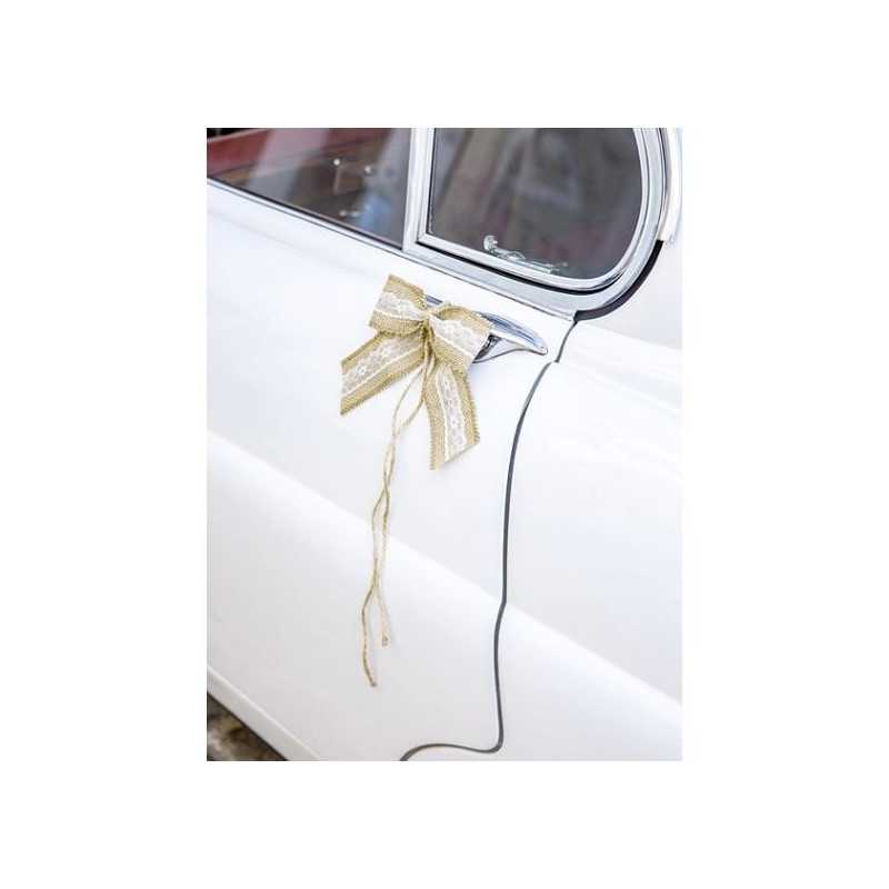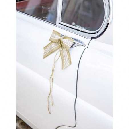 Apportez une touche champêtre et romantique à votre départ de mariage avec ce kit de décoration voiture en jute et dentelle. Élégant et naturel, il sublime la voiture des mariés et apporte une ambiance douce et festive à votre cortège.