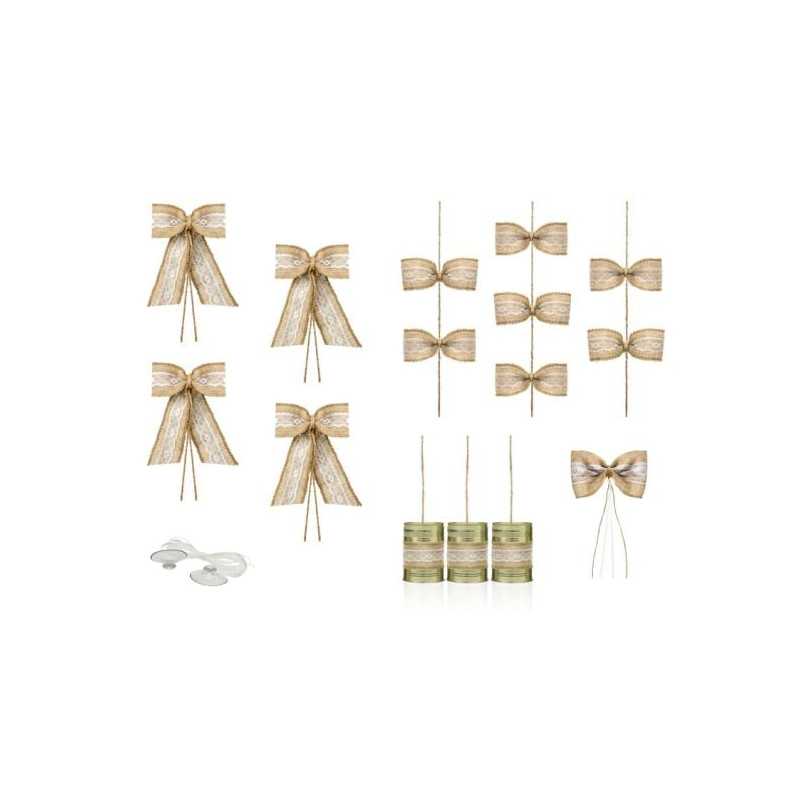 Contient : une guirlande de noeuds en jute, des noeuds en jute et dentelle, des boites de conserve et tous les accessoires nécessaires à la mise en place du kit