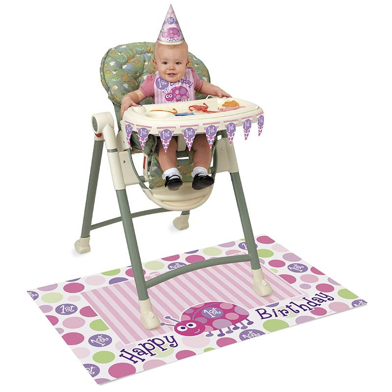 Ce pack inclut : 1 tapis plastifié décoré à mettre au sol, une banderole à fanions de 81 cm de long, 1 bavoir plastifié pour bébé, et un chapeau pour la star de la journée !