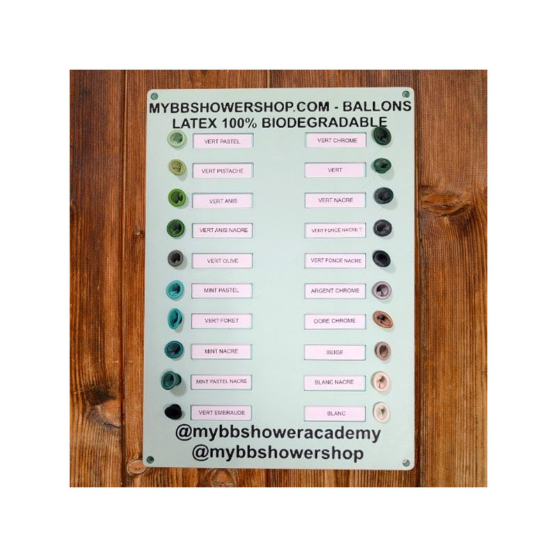Plutôt que de figer un nuancier pour une seule marque de ballons, avec parfois des ruptures, voici un nuancier où vous pouvez mettre en avant vos stocks! Oui les ballons que vous avez déjà à la maison! C'est en montrant à vos clients les ballons de manière professionnelle dont vous disposez déjà que vous pouvez optimiser votre rotation des stocks. Souvenez-vous un point que l'on met largement en avant dans nos formations ballons organiques avec la Mybbshowershop School et Academy.