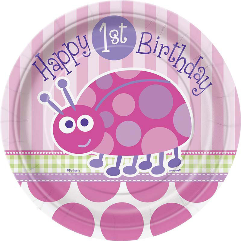 Motif bébé coccinelle rose marqué en violet " Happy 1st Birthday" pour le premier anniversaire de bébé