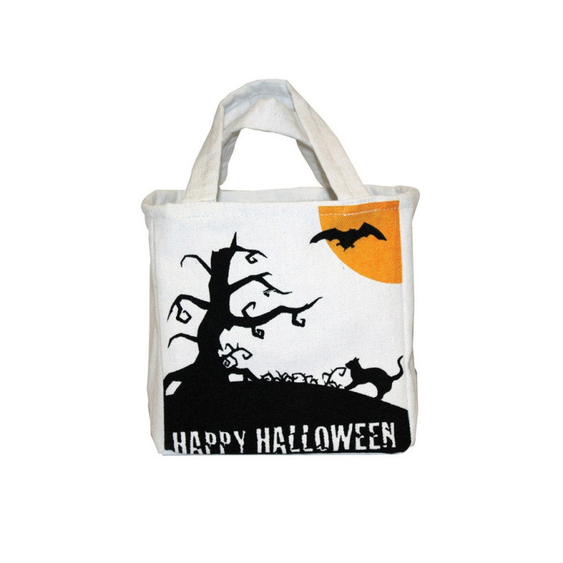 Sac en tissu Trick or treat pour la Chasse d'Halloween marqué "Happy Halloween", très qualitatif. Parfait pour regrouper sa collecte de bonbon. Motif chat et corbeau