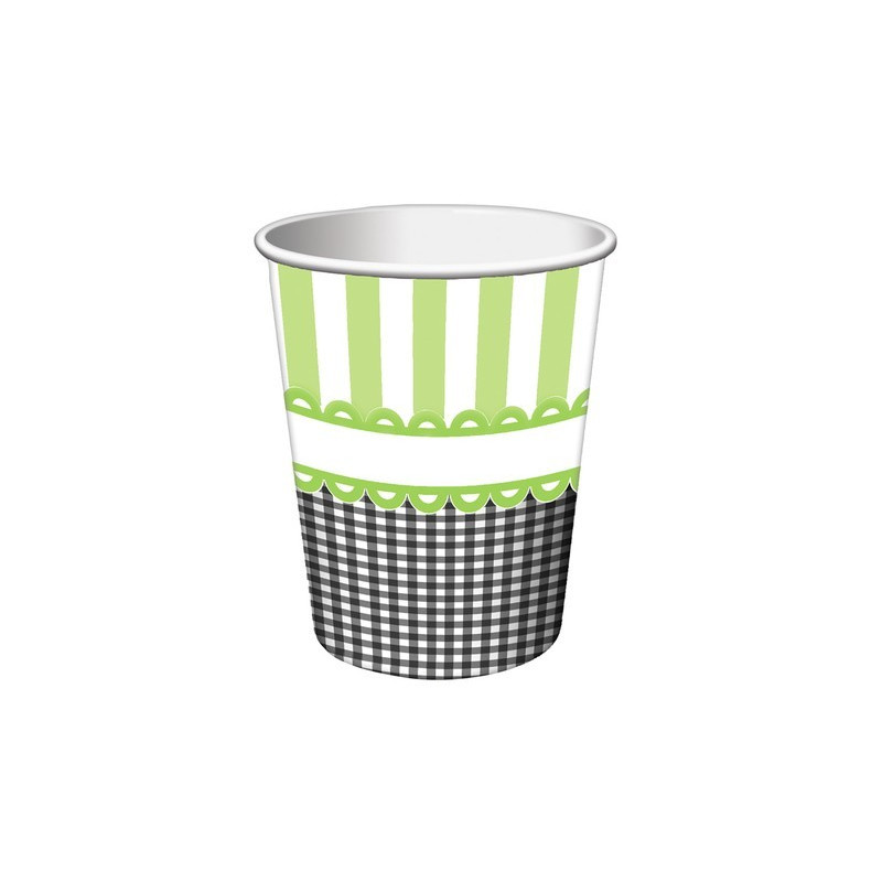 Parfaits pour l'organisation de votre thème, ces verres de la collection Sweet Petits Petons Verts très rétros avec des rayures, dentelles assorties à la collection. Couleur : vert, blanc, noir.